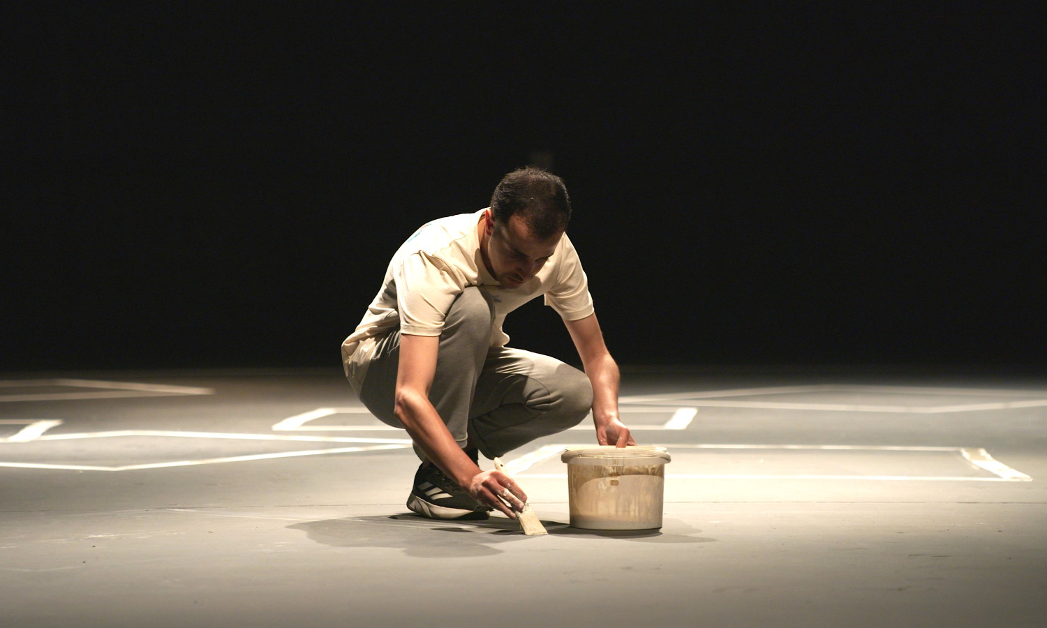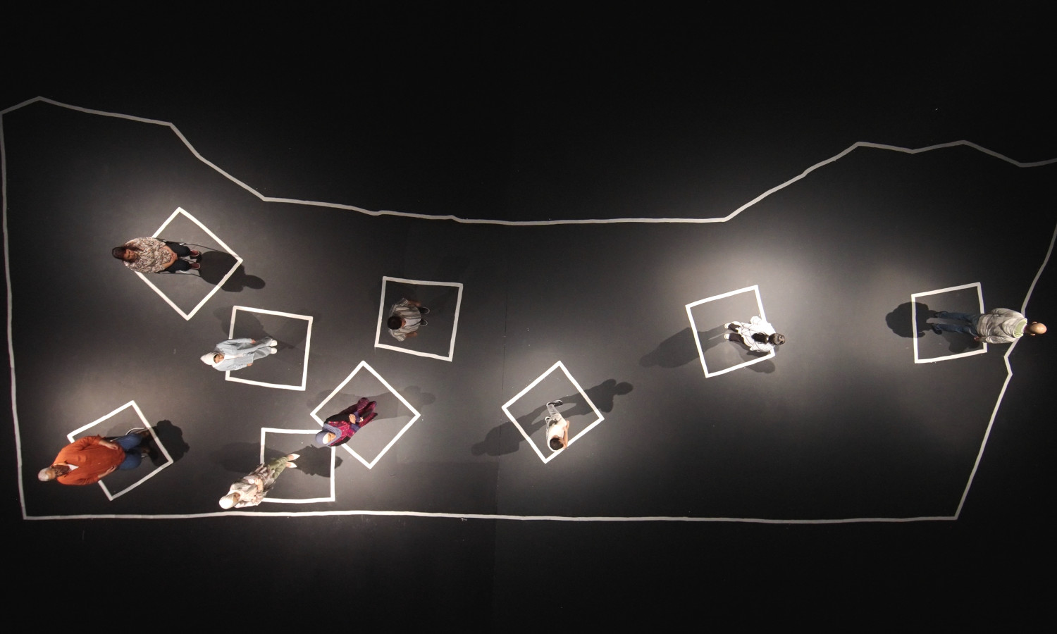 Eine Karte von Gaza, seinen Städten, Lagern und Quartieren. Weisse Farbe auf schwarzem Boden. In den notdürftig gezeichneten Umrissen erzählen neun Flüchtlinge von der Hölle, der sie entkommen konnten. Durch das Teilen ihrer Geschichten versuchen die Protagonist*innen, wieder Zugang zu sich selbst zu gewinnen und aufzuhören, nur wie Geister zu existieren